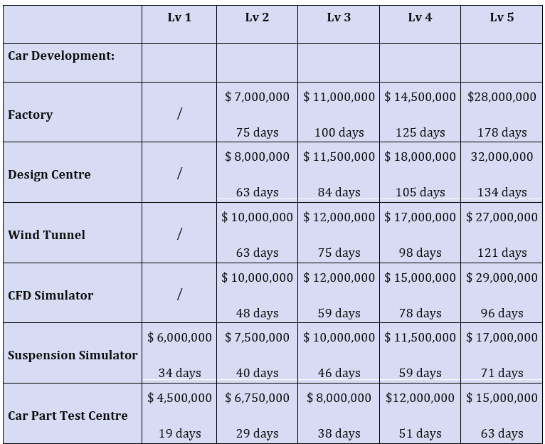 The use of CFD Mau hours and Wind Tunnel hours improves the expertise of engineers around a specific part enabling them to make better pieces of that car part in the future. When you develop a new car part keep in mind that if you want develop X car parts for the month considered, Mau hours and Wind Tunnel Hours must be corresponded, for each car part, at about the total hours divided by X. For example, if you can develop 4 car parts for the month considered is recommended that you use about a quarter of total Mau hours and Wind Tunnel hours available for that month. Instead, if you want to develop 3 car parts you should use about one third of total Mau hours and Wind Tunnel hours.