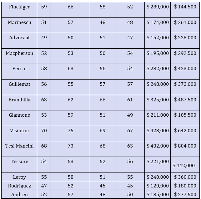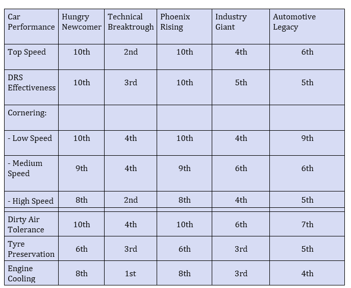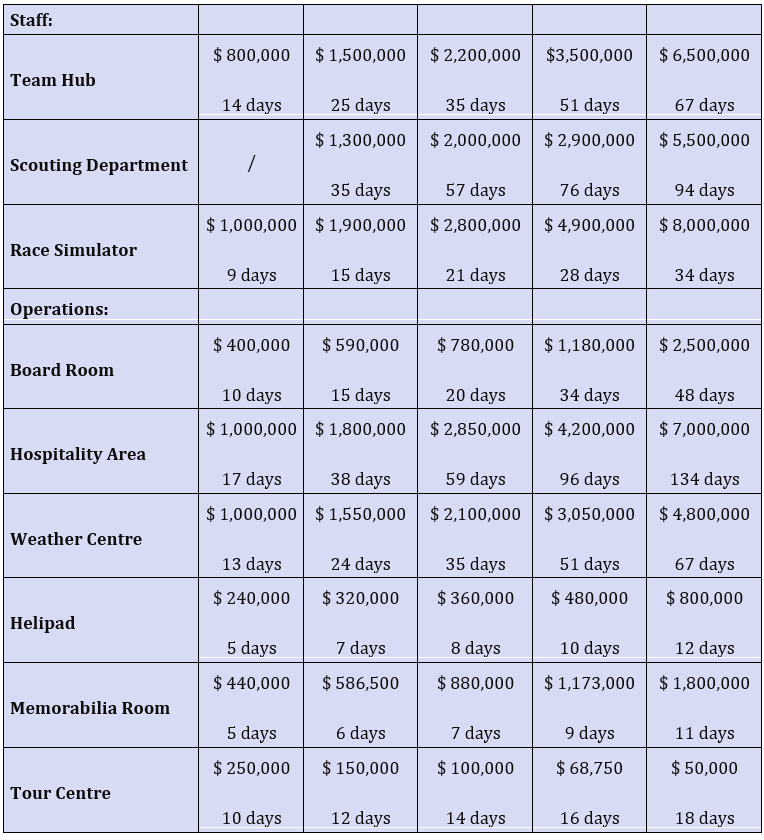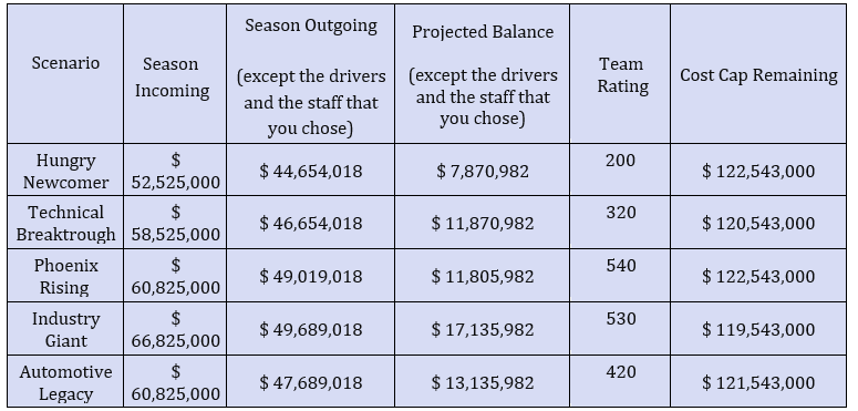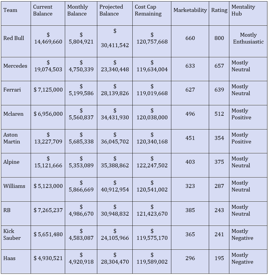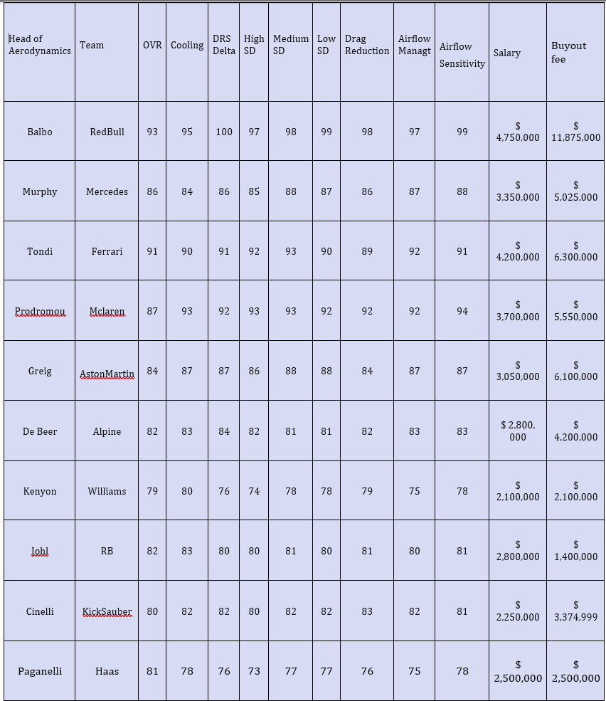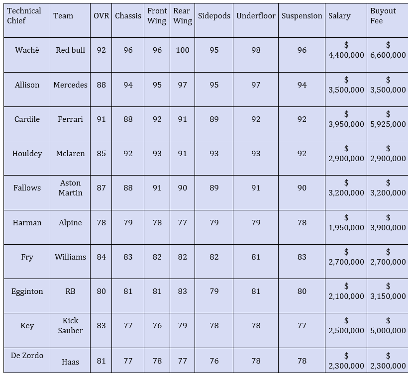 In the your own team career the tables allows to do a better choice of initial staff and drivers having available the true and complete values of stats given the fact that the overall stat often doesn’t reflects the true value of a determined staff’s member or driver. A striking example is the race engineer Bonnington that has a very high overall but all the stats are much lower than the overall. Moreover the true money that you have for the first season is much less than it appears at the very beginning of the season because there isn’t a prize money for the first season so is important to save money choosing staff and drivers more affordable and at the same time impactful.