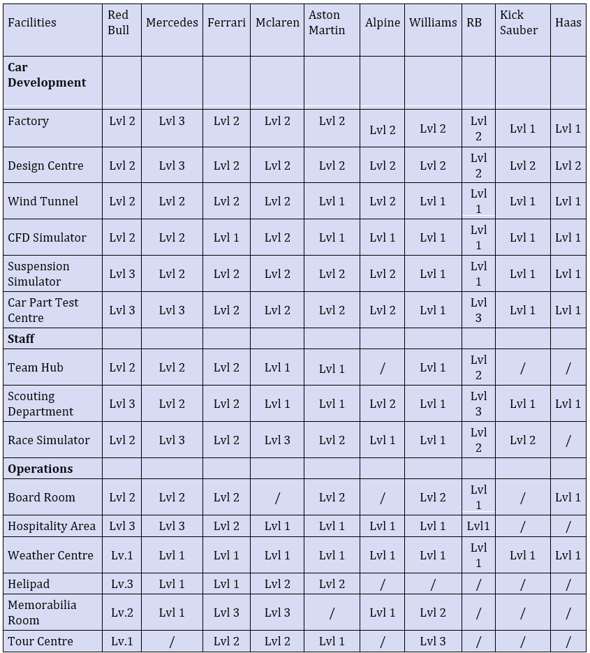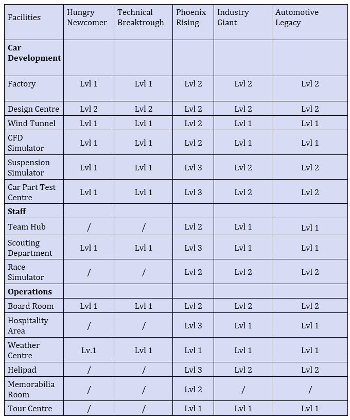 In fact in the career with a real team the tables allows you to know all stats and hiring costs of every drivers and every member of the staff without resorting to the scouting. Moreover it gives you a detailed and complete situation of every team as regard car performance, drivers and staff, facilities and financial situations, helping you to chose the best team according your gaming’s goals.