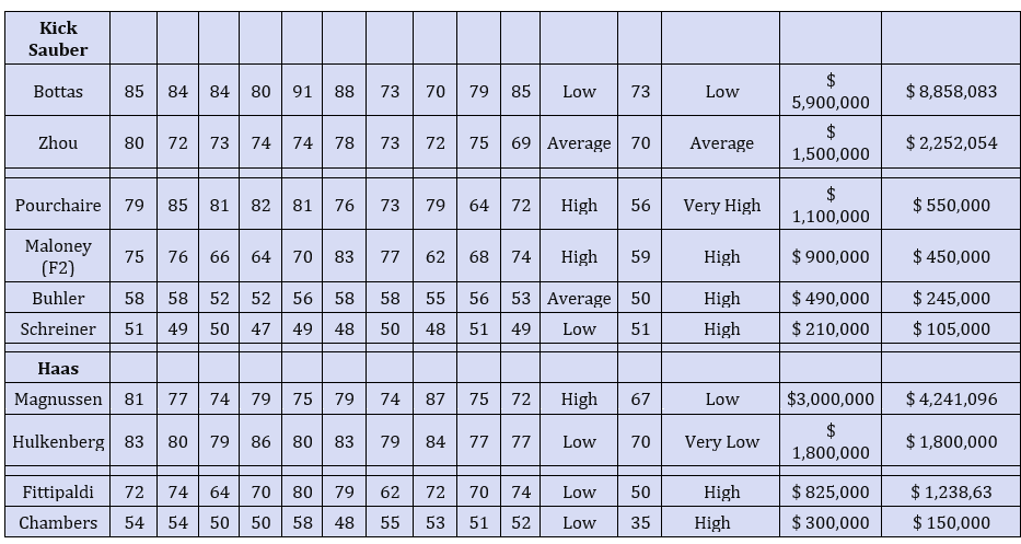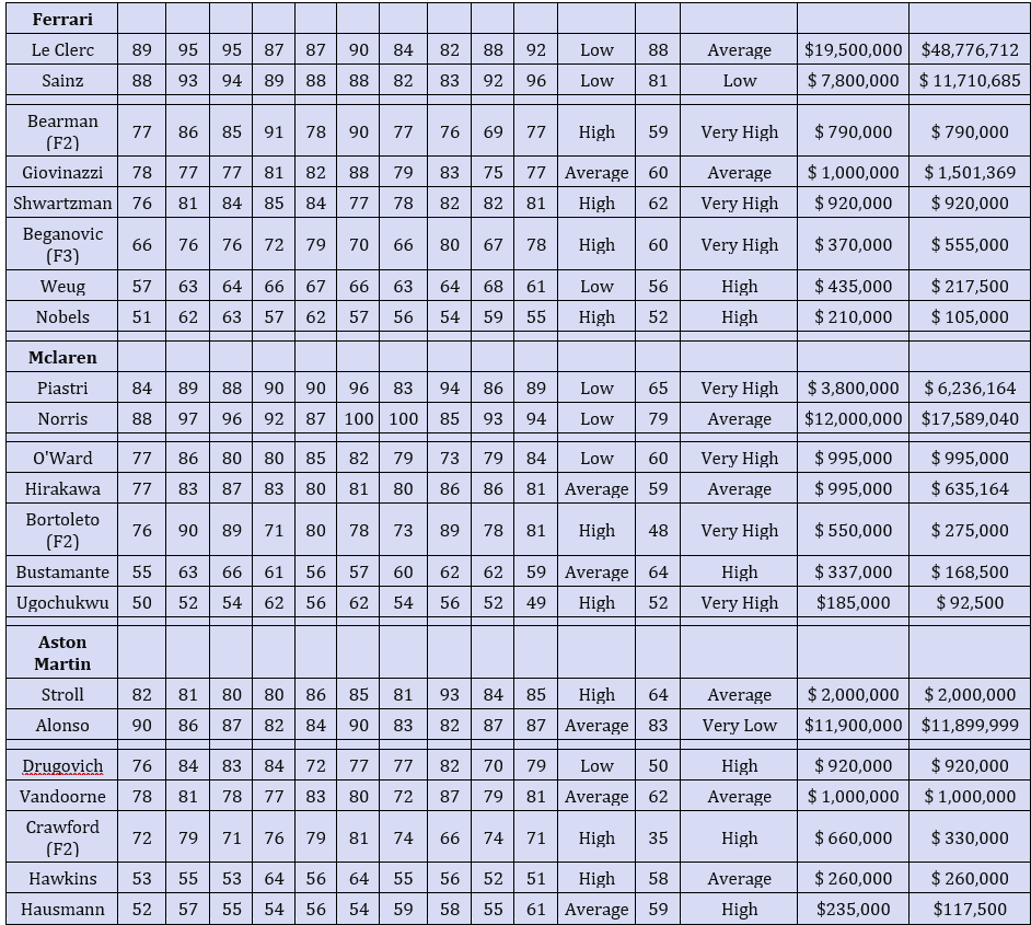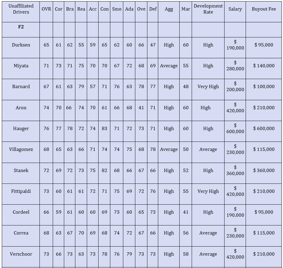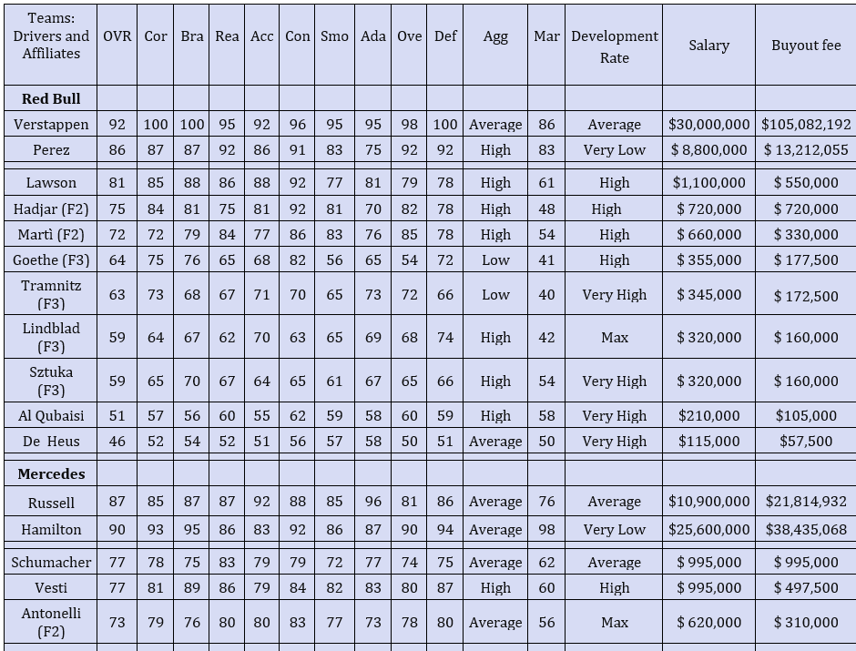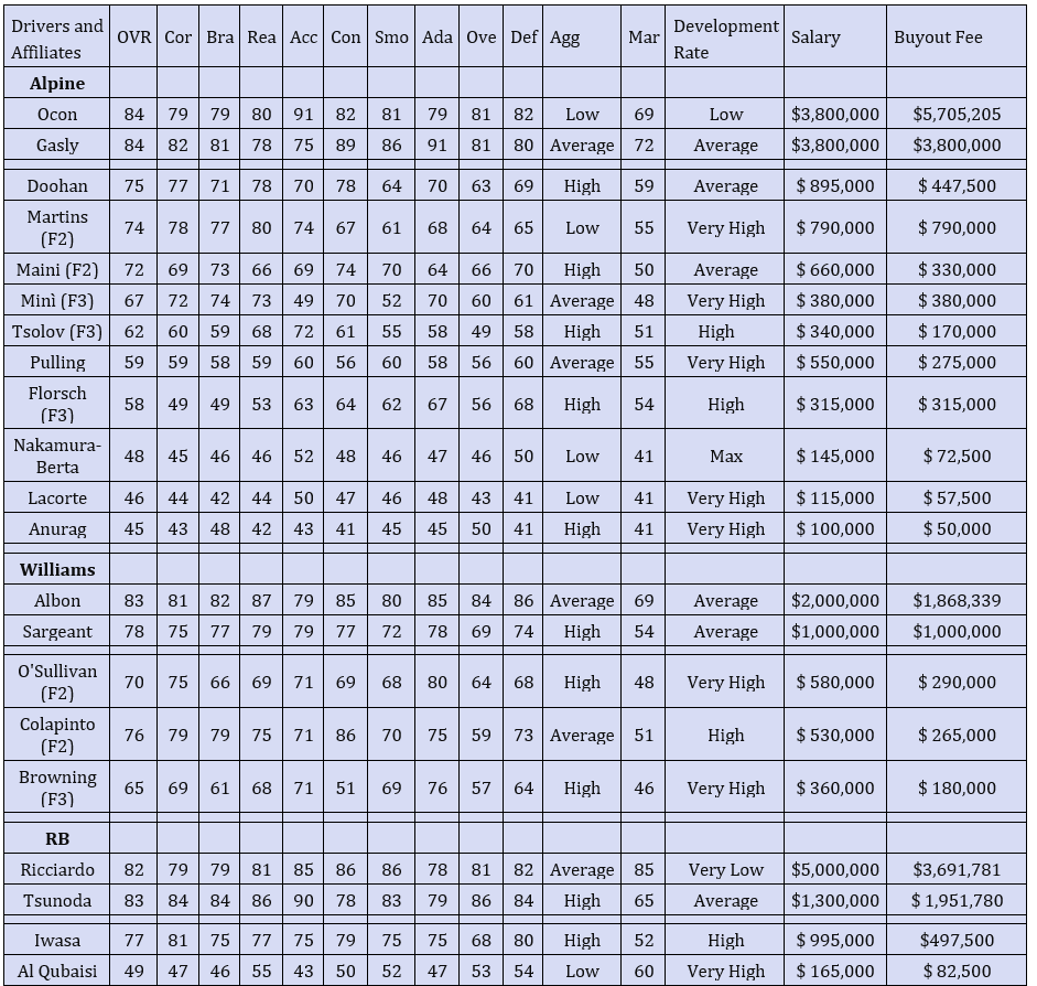These performance ratings (from cornering to defending) correspond to the stats that the driver will reach when reached half season (July). At the start of my team career, stats (that are influenced by moral) are slightly boosted or decreased in relation to the values of the table, according to the moral of the driver or the member of the staff. The buyout fee value changes in my team career according to the team you create.