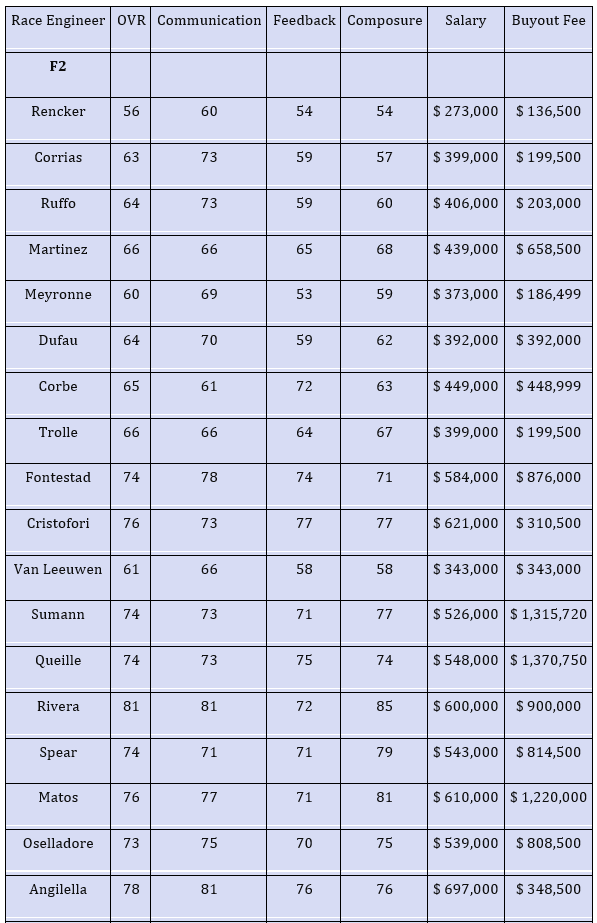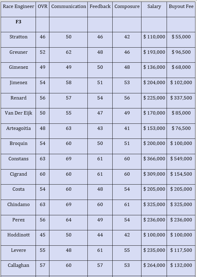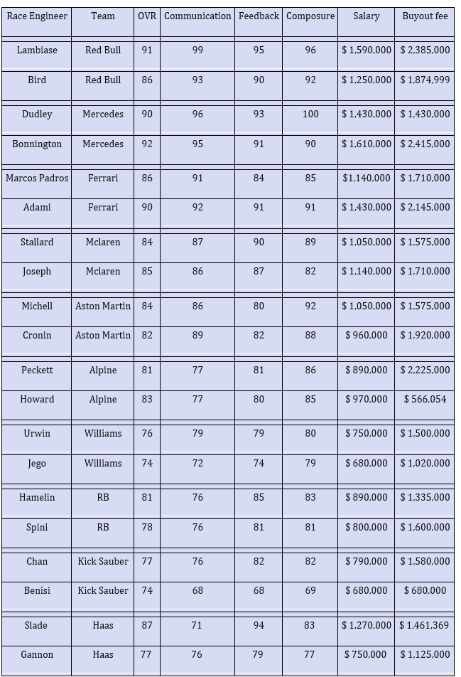 These performance ratings (communication, feedback and composure) correspond to the stats that the race engineer will reach at half season (July). At the start of my team career, stats (that are influenced by moral) are slightly boosted or decreased in relation to the values of the table, according to the moral of the driver or the member of the staff. The buyout fee value changes in my team career according to the team you create.